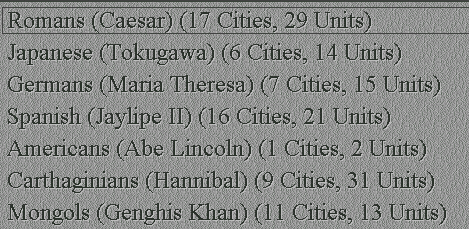 Yo soy los españoles, Fiera los romanos y Waku los mongoles. Los demas slots estan libres por el momento. No consigo recordar quienes eran los carts pero a juzgar por su numero de units no iban nada mal. Los Americanos no tienen na que hacer y los japs parece que tampoco.