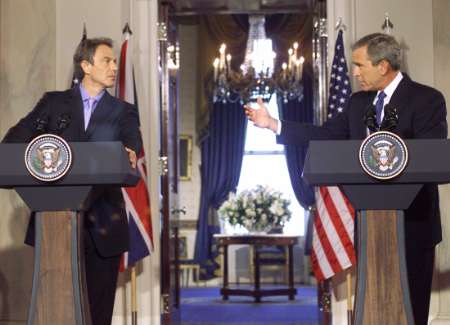 Noviembre 7, 2003 - Washington D.C. Presidentes de Estados Unidos, George Bush y de Gran Bretaña, Tony Blair; dando una conferencia conjunta para demostrar la unidad, amistad, confianza e inquebrantable voluntad militar-colonialista-conquistadora en este nuevo emprendimiento de liberacion/anexion de territorios en Venezuela