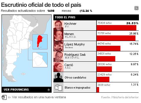 "PRIMEROS COMPUTOS OFICIALES. 958 mesas de todo el país (1,43%). 1° Kirchner 26,18%; 2° Menem 26,10%; 3° López Murphy 16,35%; 4° Rodríguez Saá 12,61%; 5° Carrió 9,4%."