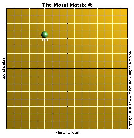 Your scored -3.5 on the Moral Order axis and 1.5 on the Moral Rules axis.