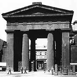 The later addition of the wondrous Station Hotel, built flush on the Euston Road, meant that one would drive through the Hotel alley before being startled and amazed by the appearance of the main Euston Arch. This bold 'Doric Portico' structure were a major sight to behold for London and its visitors, a very important element on the Victorian Architectural trail, so imagine the shock when, in the sixties, after the arch had stood untouched and loved for 125 years, its destruction was ordered. There was a minor protest and furore. The Victorian Society had its 'Save the Arch' campaign, led by former Poet Laureate Sir John Betjeman. But the government was not interested. The ever obedient populace saw the Arch's fate as academic. So, in 1962, it was all over, and the whole area flattened to make way for the vulgar terminus that exists today. All the brilliant buildings of the original station were wiped out, just so the developers could move in and build the present ugly carcass. Evidently, most of the Arch was transported from London, so that the villain of this treachery could stone landscape his garden. So at least there is still an option to search, recover, and rebuild, and the government might one day right one of London's most evil architectural wrongdoings.
