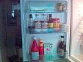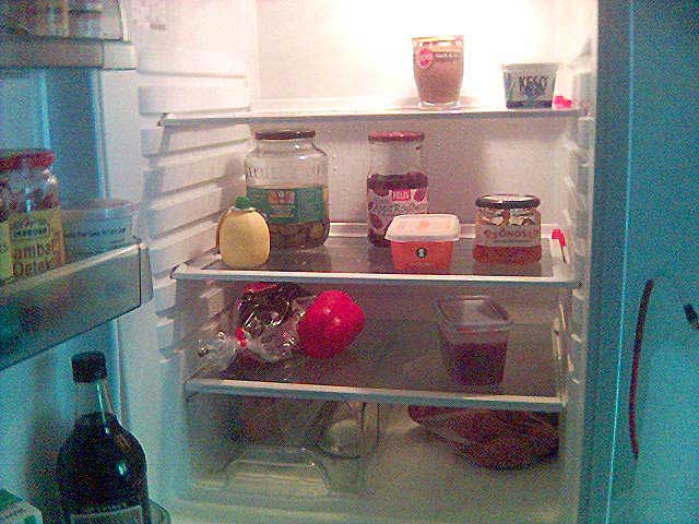 Middle shelf: Lemon juice, margarine (for bread), pickled cucumber, pickled beetroot, orange marmalade