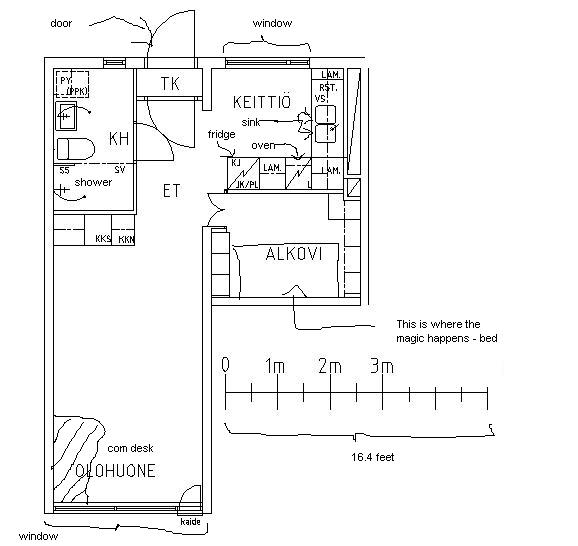 The markings on toilet doesn't really matter, the ones in the kitchen are the norm like sink, the oven etc. The rest of them squares in ALKOVI and in living room are basically closets.