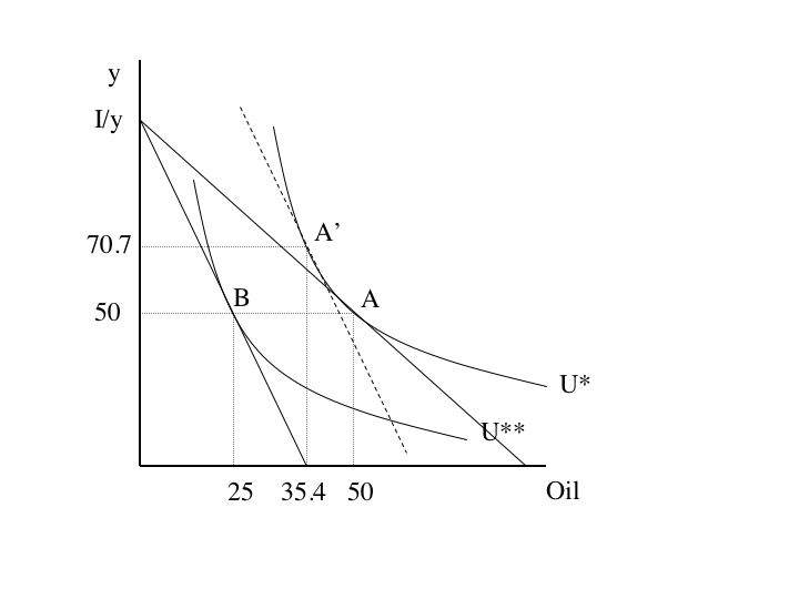 Lets say the price goes to $2 for oil. The government decides to give the consumers cash. This increases their income, and they now buy at point A’, which gives them more of both goods then before. This costs the government just over $20.