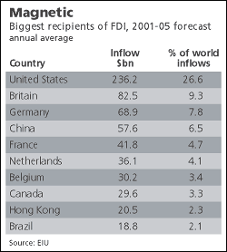 France was the biggest recipient of extra-EU foreign direct investment in 2003 (let's ignore Luxembourg in this), ahead of the UK, and then Spain and Germany, 2 other Eurozone countries.