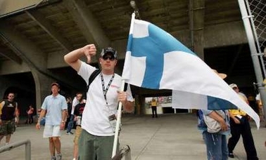 A fan of McLaren driver Kimi Raikkonen of Finland gives the thumbs down as he leaves the early from the U.S. Formula One Grand Prix at the Indianapolis Motor Speedway June 19, 2005. Only six cars started after a fiasco over tire safety forced the remaining seven teams to pull out after the warm-up lap. REUTERS/Carlos Barria