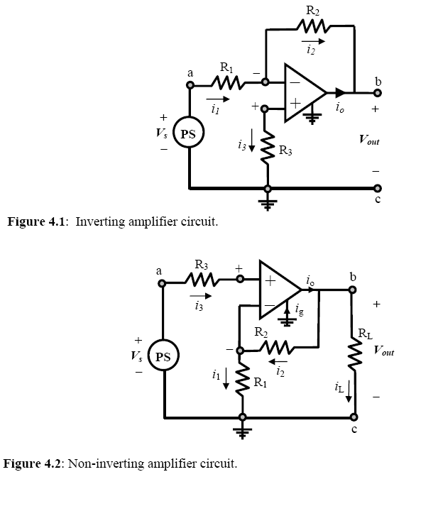 voltage Vs, and resistors R1 and R2. Determine the amplification factor for each circuit.