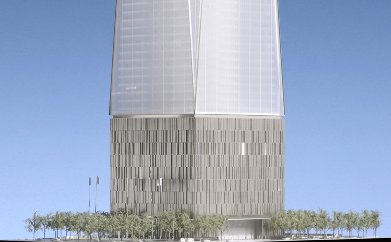 The new obelisk-shaped tower, standing on an enormous 20-story concrete pedestal, evokes a gigantic glass paperweight with a toothpick stuck on top.