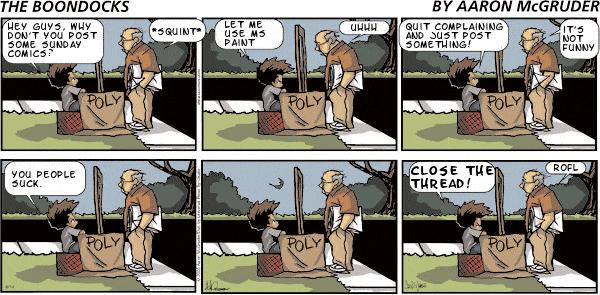 OMFG. Get a life. No one and I mean NO ONE posted their FAVORITE comic of Sunday. That was the whole frigging point of this thread. It was a Sunday morning idea for people who READ the frigging Sunday paper. I posted my favorite comic of the day. If you didn't find it funny, TFB. Post your own, but hey, guess what, Sunday is OVER and now its too late. Time to lock this baby. YPS!"In Italy for 30 years under the Borgias, they had warfare, terror, murder and bloodshed. But they produced Michelangelo, Leonardo da Vinci and the Renaissance. In Switzerland, they had brotherly love. They had 500 years of democracy and peace. And what did that produce? The cuckoo clock."