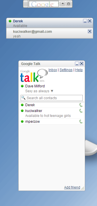 Yes I have iChat, but no one using GoogleTalk (except for people like you, who I also have on MSN). It will be one thing when GoogleTalk, which may in itself be a far superior IM program, can be used to chat w/ people using AIM, etc. But if all you can do with this amazing program is talk to the 300 other Google fanatics, then what's the point?