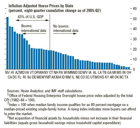 Attached is an interesting graph from the IMF about the US real estate market. In short, some states are experiencing house price booms and some not. Nevada, Hawaii, California, DC, Arizona, Florida, Maryland and Virginia are experiencing booms. Are these booms creating a bubble nationwide?