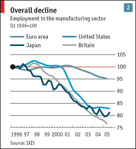 What is new is the recent absolute decline in factory employment. Although manufacturing has long been shrinking as a proportion of America's expanding workforce, the number of industrial jobs stayed more or less the same between 1970 and the late 1990s. Since then, however, manufacturing employment has fallen in every year. Chart 2 shows that since 1996 the number of manufacturing jobs has shrunk by close to one-fifth in America, Britain and Japan. In the euro zone, the average loss has been only 5%.