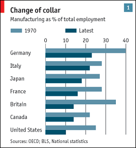 The share of manufacturing has also been falling in all other developed economies since 1970. The sharpest decline has been in Britain, where such jobs have dropped from 35% to 14% of the workforce (see chart 1). Indeed, the actual number of manufacturing jobs has fallen by half since 1970. The smallest drop has been in Italy, where manufacturing still accounts for 22% of employment. Germany is the only other big economy where more than one-fifth of workers are still in the business of making things. In Japan, the share has dropped to 18%.