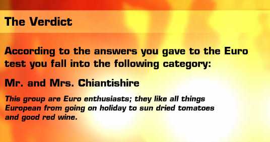 Apparantly I am a Euro enthusiast who likes all things European, including sun-dried tomatoes and fine red wine. Not a single question though about EU bureaucracy, regulation, or arrogance.
