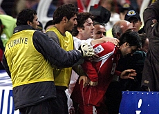 actually heres what happened, the turkish guy kicked Valon Behrami on his way on (swiss #34, with the blond long hair) you can see him stumble. then behind him comes #14 Benjamin Huggel (late substitute for Marco Streller, he plays defense) kick the coach. and then he grabs the turk (alpay) by the neck and hauls him down"Everything for the State, nothing against the State, nothing outside the State" - Benito Mussolini