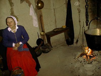 Goodwife Prudence No Habl'Espanol warms herself with a burning Spaniard: