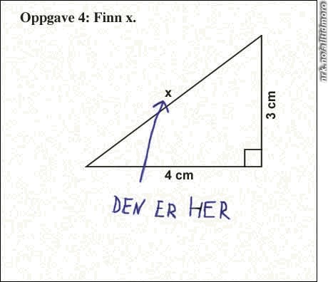 Norwegian math quiz (translation: Task: Find X. Answer: It's here!)
