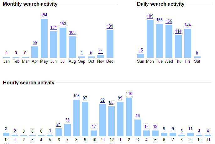 Lots of fun stuff. I search the most on Monday at the 4:00 pm hour. Rarely do I do a search from 5:00 am to 11:00 am. I do more searches in the 3:00 am hour than I do in the 10:00 pm hour.