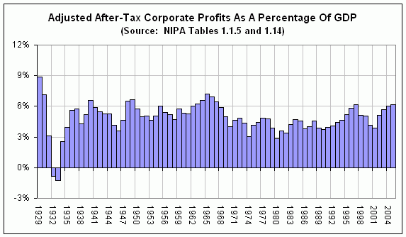 In 2005, on a before-tax basis, US corporate profits were the highest as a percentage of the economy since 1968. On an after-tax basis, the only year since 1967 with higher profits than 2005 was 1997. I put together a chart that shows these calculations, which I attach.