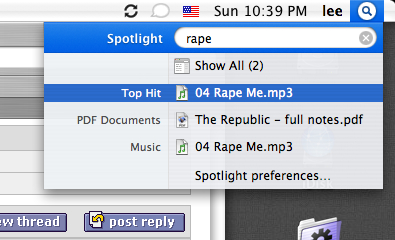 My friend has been chatting with his girlfriend on Adium. And guess what is Spotlight's first hit when I type 'rape'? His chatlogs. Hmmm...