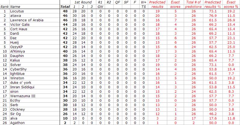 Wow... went from being 4 behind leader, to 10 points!! Of course, since I predicted England would win the whole thing I'm pretty screwed.