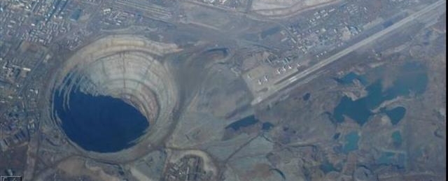 Here are some pictures I found of an open pit diamond mine in the Russian town of Mirny, 800 km (500 miles) west of Yakutsk. It's just.. I don't know, amazing that somebody would choose to mine anything this way.