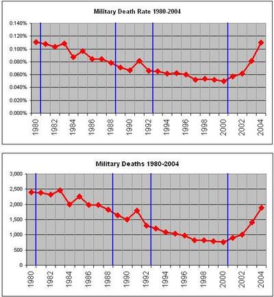 Or look at it this way. During Clinton's first four years, there were 4,302 active-duty deaths. That number rose to 5,187 during President Bush's first four years — years that were marked by two wars in response to the terrorist threat.