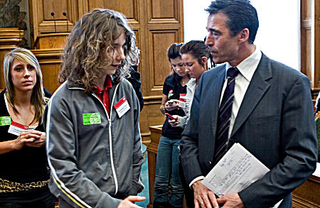 This is what we see here, PM Anders Fogh Rasmussen talking to one of the students. Others, however, attend to more interesting matters..