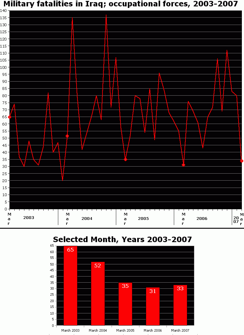 Only 17 members of the US military in Iraq have been killed since February 14 till March 13, compared to 42 from January 13 to February 13; the rate was on the decline during the first month of the security crackdown, compared to a month before.