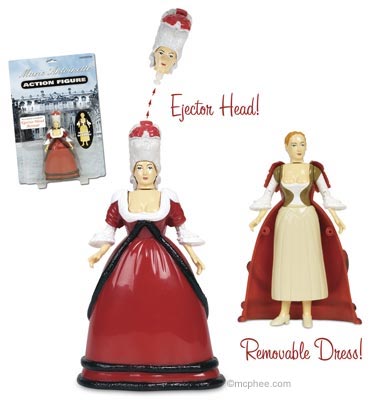 Marie Antoinette's reign as the Queen of France was clouded in controversy. Her extravagant lifestyle led many to believe that she was not worthy of the throne and eventually she became widely despised as the epitome of incompetence and frivolity within the French royalty. During the French Revolution, Marie was stripped of her crown, imprisoned and beheaded by guillotine in front of a cheering crowd. This 5-1/2" tall, hard vinyl figure features amazing "Ejector Head Action," and comes with a removable plastic wig and dress.