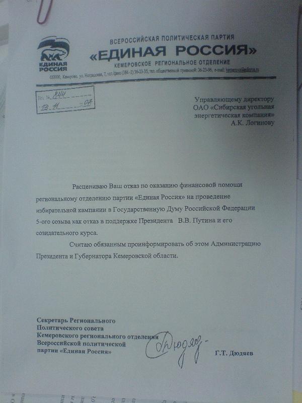 I consider your refusal to give financial aid to the regional headquarters of the "United Russia" party in support of our election campaign to the 5th Duma of the Russian Federation to be a refusal to support President V.V.Putin and his creative course.