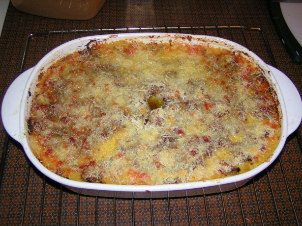 Grease the casserole dish. Make layers, like: Mix-Yoghurt-Hacked meat-Mix-Yoghurt-Hacked Meat-Mix-Yoghurt. Put the grated parmesan on top, sprinkle with olive oil.