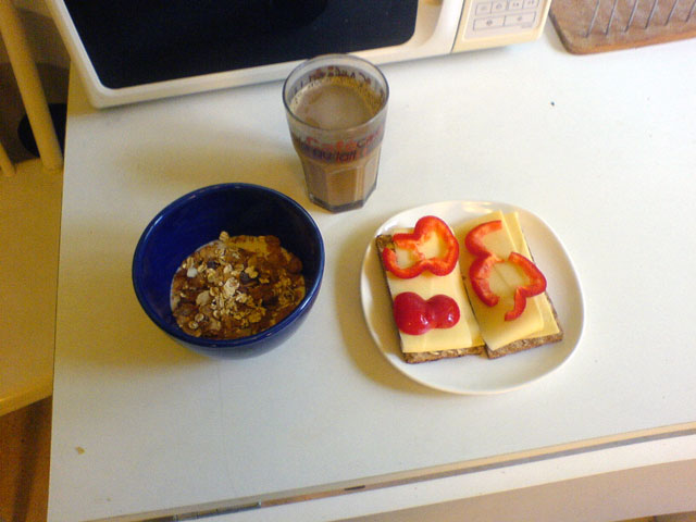 This mornings breakfast. Filmjölk with müsli, crisp bread with cheese and bell pepper and caffe latte