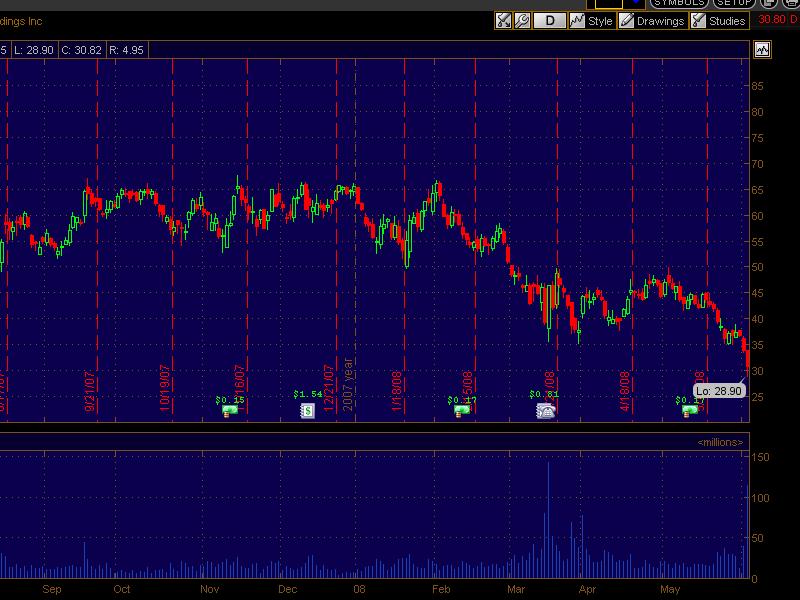 Well, whatever is going on, the stock market sure doesn't like it. Rumors that LEH used the window again, denial by LEH, rumors that LEH is considering raising capital by issuing more common (haven't seen a denial), even some rumors that there's a run on LEH.