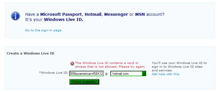 So I just went and tried to register a new MSN/Hotmail username. Unless I experienced a bizarre bug or did something horribly wrong, it wouldn't let me register any username with the word "american" in it.