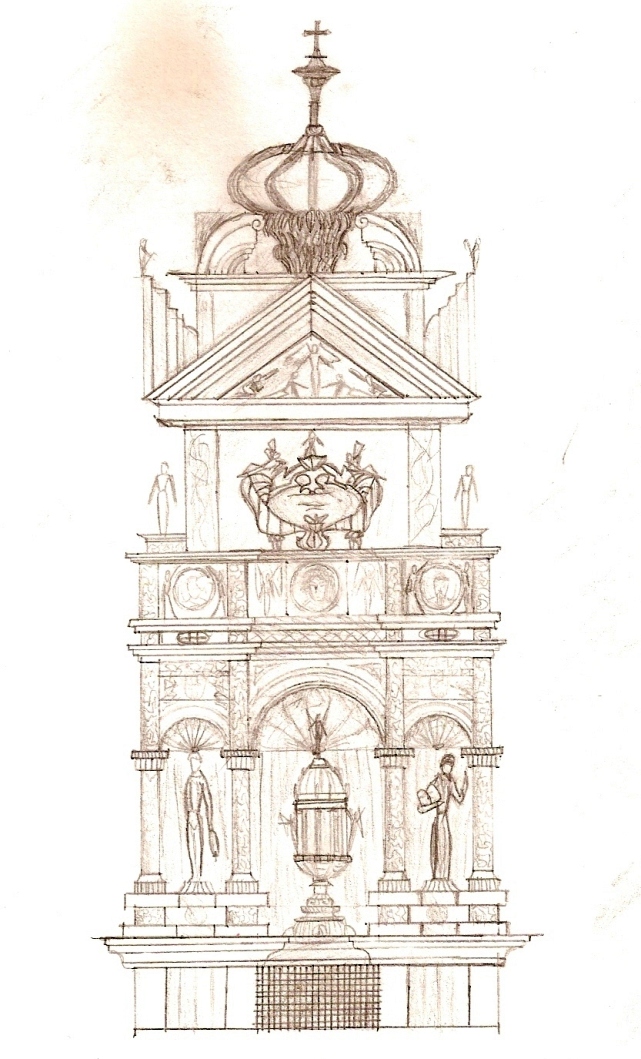 This is nothing, just some drawings of a collumnade I thought of during lessons. Later I've made a big drawing out of it, changing some details and proportions (the upper part was taller), and it was one of my best sketches, I kept it in a, hm, box or whatever of its own. And so it got lost and all I have are those simple drawings