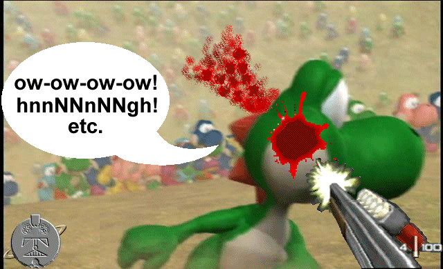 I even have a badly Photoshopped pic of HMB shooting a Yoshi in the head with a shotgun from Goldeneye007. This may count as an example of illustrational masterfeces.