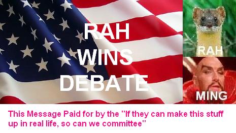 Now shortening it to 'We're not Ming, we don't suck' pretty much accomplishes nothing since everyone knows of Ming's suckage. But in fact he has an over abundance of suckability and by extending it to 'We're not Ming, we don't suck, not like them other guys', we spread some of Ming's suck on to all the other candidates. This is a process in politics known as suckification through association, and can be quite effective.
