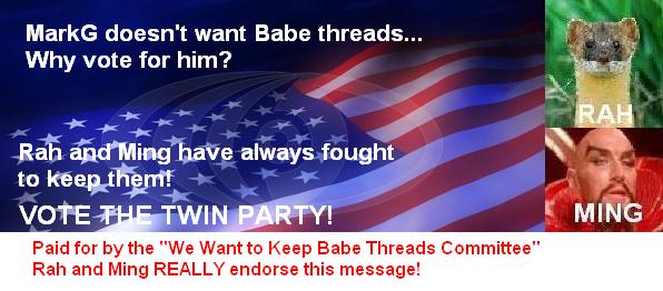my position on babe threads has been proven correct. where are the babe threads now? it was just a nonsense that distracted the apolyton people from real issues like the re-unification of the OT and the frog smiley! not to mention the whole thing about tax reduction as well as reducing taxes!