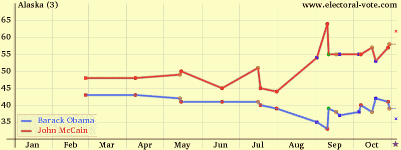 McCain-Palin was ahead in Alaska pre election polling by as much as 55-40. The Haysresearch Poll that came out Sunday indicated that gap had closed to 2.7 points! That poll was certainly consistent with Palin's reverse meteoric fall in popularity within the state of Alaska. In that same Haysresearch Poll released on November 2, Question 2 addressed Governor Palin's positive-negative rating. 11% of Alaskans surveyed said their opinion of Palin had become more positive while 37% indicated they were more negative towards Palin. Yesterday's vote contradicts those polls. McCain-Palin won Alaska 61-36! A 25 POINT SPREAD!!! An identical point spread as the 2004 Election.