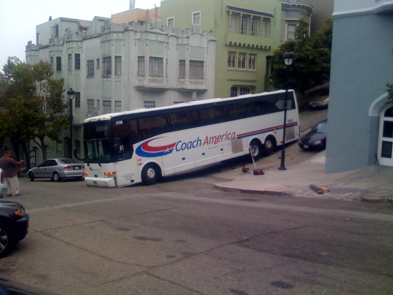 no problem - put the guy standing in front of the bus under it - then titter-totter it so that the powered wheels get back on the ground. Maybe if he jumps where he stands, that will suffice, too...
