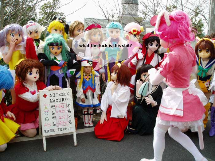 I'm sure there's a perfectly good explanation for what's going on here. It's bound to be some sort of Japanese kooky whacky manga joke sort of thing. Yeah, that'll be it. It can't possibly be one cosplay female just randomly sticking a RUBBER FIST STRAIGHT UP another cosplay female.