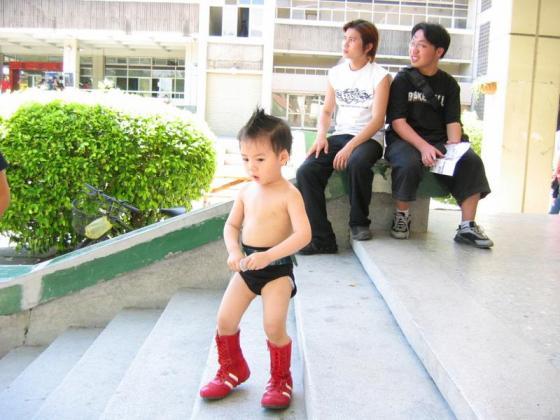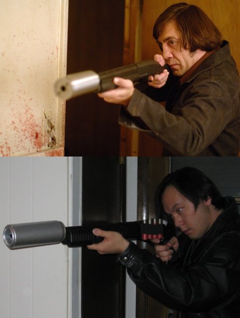Halloween this year at Bing's house. He's dressing up as Anton Chigurh from "No Country For Old Men". The shotgun is made from an Airsoft gun, a 22 oz can, and a flashlight to hold the "silencer" in place.
