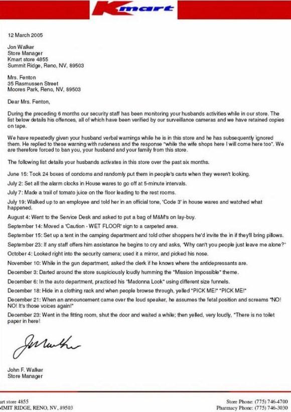 Not sure whether to believe that supermarket letter is faked, which looks probable, or whether some idiot tried to go through this old joke and carry them out. Much as I'd like to believe he'd do that, the letter is written to his wife, which seems highly unlikely, and so I have to conclude it's a fake. The headed paper doesn't look very realistic - no company number, etc, which are required on corporate headed paper.