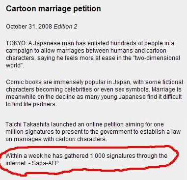 Key word is "internet". I'd merrily sign up to such a petition as well, just as I like to propagate the Church of the Flying Spaghetti Monster.DISCLAIMER: the author of the above written texts does not warrant or assume any legal liability or responsibility for any offence and insult; disrespect, arrogance and related forms of demeaning behaviour; discrimination based on race, gender, age, income class, body mass, living area, political voting-record, football fan-ship and musical preference; insensitivity towards material, emotional or spiritual distress; and attempted emotional or financial black-mailing, skirt-chasing or death-threats perceived by the reader of the said written texts.