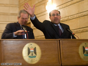 President Bush, left, ducks a thrown shoe as Iraqi Prime Minister Nuri al-Maliki tries to protect him Sunday.