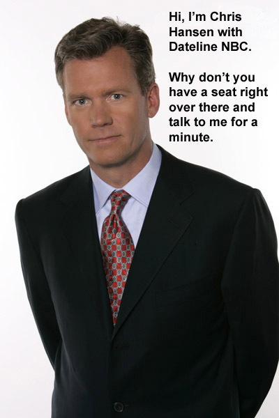 Chris Hansen does not look like a pedophile! He doesn't have a thin whispy stache on his upper lip nor does he have a mullet and those oversized glasses.