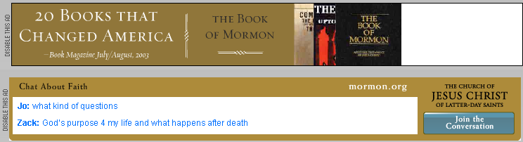 I saw this website ad and I decided I must become a mormon. I'm giving 10% of my income to the church, I wear gay magic underwear, and I've dumped my boyfriend of six years and proposed to Butch, a former Lesbian who saw the same ad as I did. She's already preggers with my first of 21 children.