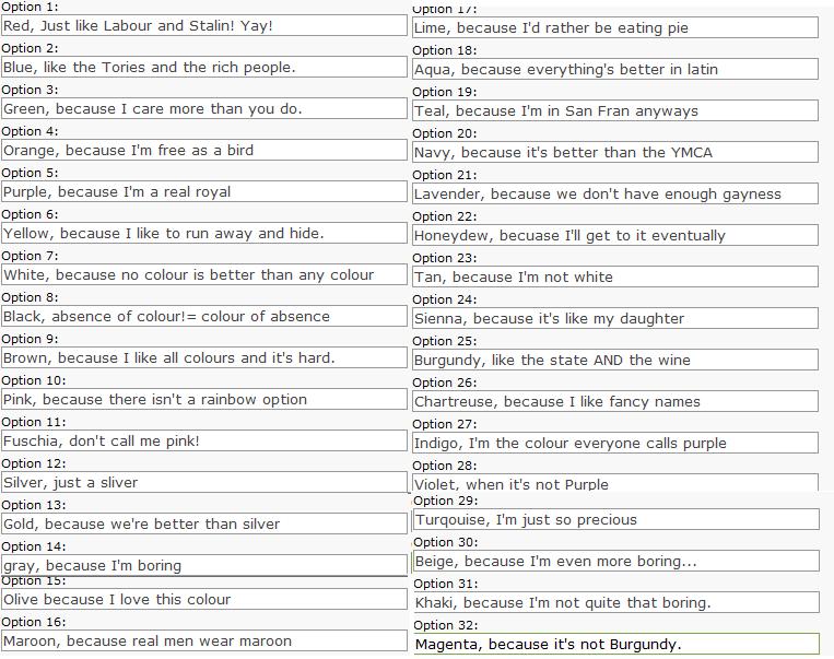 Please post your choices in the thread. You get two choices, colour A and colour B.