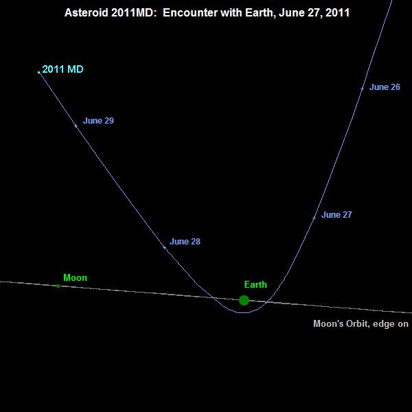 Asteroid 2011 MD was discovered Wednesday (June 22) by LINEAR, a pair of robotic telescopes in New Mexico that scan the skies for near-Earth asteroids. The best estimates suggest that this asteroid is between 29 to 98 feet (9 to 30 meters) wide.